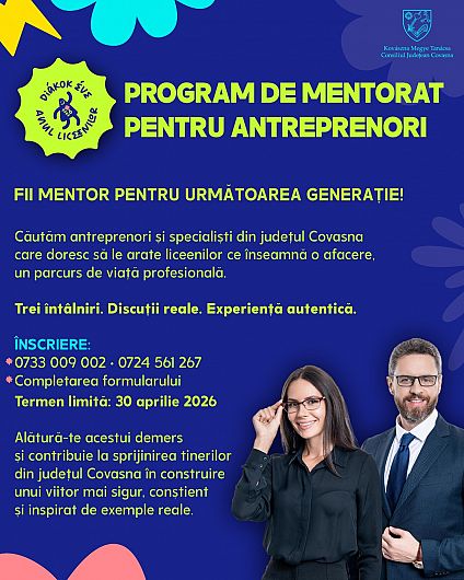 Consiliul Județean Covasna deschide în această primăvară înscrierile pentru un program de mentorat antreprenorial, o inițiativă desfășurată în cadrul programului „Anul Liceenilor”. Începând cu data de 1 iunie, specialiști și oameni de afaceri din județ se vor întâlni cu elevii din clasele IX–XII pentru a le oferi o perspectivă reală asupra pieței muncii și a parcursului profesional. Până atunci este deschis apelul pentru antreprenori doritori să devină mentori.