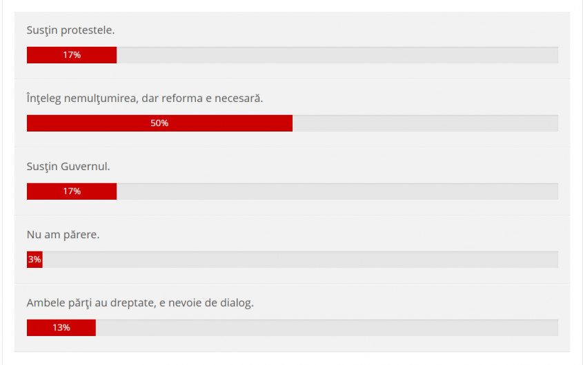 17% dintre cititori spun că susțin protestele, iar tot 17% au spus că sprijină Guvernul. În plus, 13% cred că ambele părți au dreptate și că e nevoie de dialog pentru a găsi soluții bune pentru toată lumea. Doar 3% nu au o părere clară.