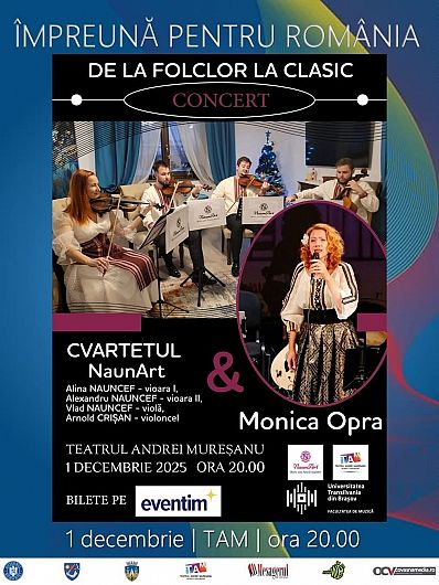 Seara de 1 Decembrie, ora 20:00, aduce în centrul vieții culturale din Sfântu Gheorghe unul dintre cele mai așteptate momente artistice ale acestei perioade: concertul „De la folclor la clasic”, susținut de Monica Opra și Cvartetul NaunArt, pe scena Teatrului „Andrei Mureșanu”. Evenimentul propune o întâlnire sonoră de profunzime, în care temele folclorice românești sunt rafinate prin limbajul muzicii de cameră, conturând o experiență în care tradiția și clasicul se completează firesc.