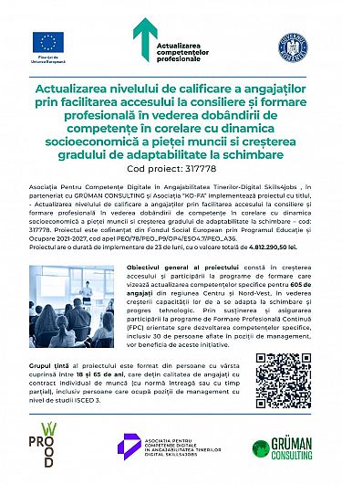 Proiectul Actualizarea nivelului de calificare a angajaților prin facilitarea accesului la consiliere și formare profesională în vederea dobândirii de competențe în corelare cu dinamica socioeconomică a pieței muncii şi creșterea gradului de adaptabilitate la schimbare (Cod SMIS 317778) este o inițiativă cofinanțată din Fondul Social European prin Programul Educație și Ocupare 2021-2027.