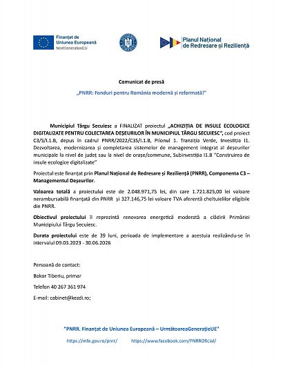 Municipiul Târgu Secuiesc a FINALIZAT proiectul „ACHIZIȚIA DE INSULE ECOLOGICE DIGITALIZATE PENTRU COLECTAREA DEȘEURILOR ÎN MUNICIPIUL TÂRGU SECUIESC”, cod proiect C3/S/I.1.B, depus în cadrul PNRR/2022/C3S/I.1.B, Pilonul 1. Tranziția Verde, Investiția I1. Dezvoltarea, modernizarea și completarea sistemelor de management integrat al deșeurilor municipale la nivel de județ sau la nivel de orașe/commune, Subinvestiția I1.B “Construirea de insule ecologice digitalizate”