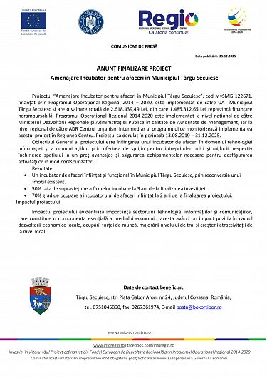 ANUNȚ FINALIZARE PROIECT Amenajare Incubator pentru afaceri în Municipiul Târgu Secuiesc