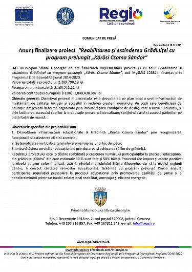 UAT Municipiul Sfântu Gheorghe anunță finalizarea implementării proiectului cu titlul Reabilitarea și extinderea Grădiniței cu program prelungit „Kőrösi Csoma Sándor”, cod MySMIS 123814, finanțat prin Programul Operațional Regional 2014-2020.