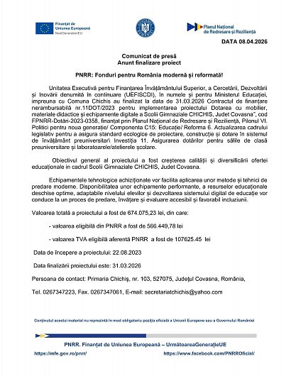 Unitatea Executivă pentru Finanțarea Învățământului Superior, a Cercetării, Dezvoltării și Inovării denumită în continuare (UEFISCDI), în numele și pentru Ministerul Educației, impreuna cu Comuna Chichis au finalizat la data de 31.03.2026 Contractul de finanțare nerambursabilă nr.11DOT/2023 pentru implementarea proiectului Dotarea cu mobilier, materiale didactice și echipamente digitale a Scolii Gimnaziale CHICHIS, Judet Covasna”, cod FPNRR-Dotări-2023-0358, finanțat prin Planul Național de Redresare și Reziliență, Pilonul VI. Politici pentru noua generație/ Componenta C15: Educație/ Reforma 6. Actualizarea cadrului legislativ pentru a asigura standard ecologice de proiectare, construcție și dotare în sistemul de învățământ preuniversitar Investiția 11. Asigurarea dotărilor pentru sălile de clasă preuniversitare și laboratoarele/atelierele școlare.