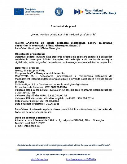 Comunicat de presă: Anunţ finalizare proiect „Achiziția de insule ecologice digitalizate pentru colectarea deșeurilor în municipiul Sfântu Gheorghe, Etapa II”