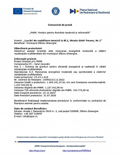 Comunicat de presă: Anunţ finalizare proiect „Lucrări de reabilitare termică la Bl. 1, Strada Gödri Ferenc, Nr. 1”