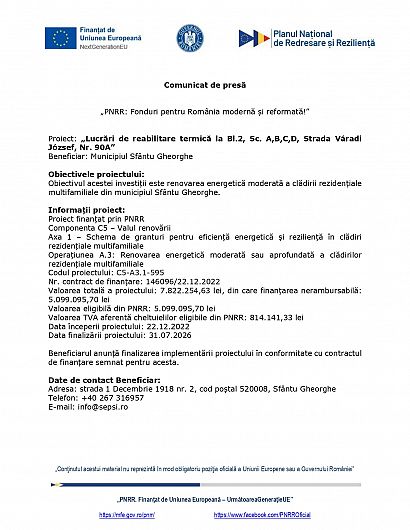 Comunicat de presă: Anunţ finalizare proiect „Lucrări de reabilitare termică la Bl.2, Sc. A,B,C,D, Strada Váradi József, Nr. 90A”