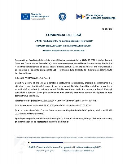 Comuna Ozun, în calitate de beneficiar, anunță finalizarea proiectului nr. 32/24.10.2022, intitulat „Drumul Conacelor Comuna Ozun, Sat Bicfalău”, care a vizat restaurarea, consolidarea și conservarea a 8 obiective – case tradiționale/conace de pe raza satului Bicfalău, comuna Ozun, proiect finanțat prin Planul Național de Redresare și Reziliență, Componenta C11 – Turism și cultură, Investiția I1 – Promovarea celor 12 rute turistice/culturale.