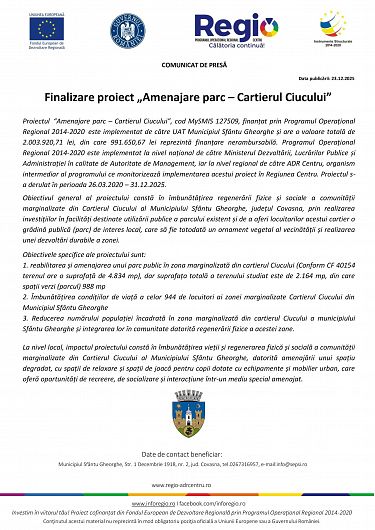 Comunicat de presă: Finalizare proiect „Amenajare parc – Cartierul Ciucului”