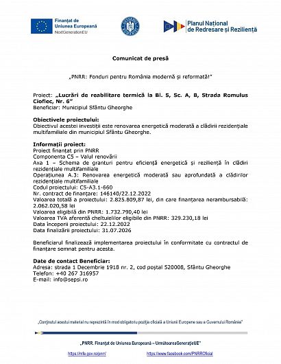 Comunicat de presă: Anunţ finalizare proiect „Lucrări de reabilitare termică la Bl. 5, Sc. A, B, Strada Romulus Cioflec, Nr. 6”