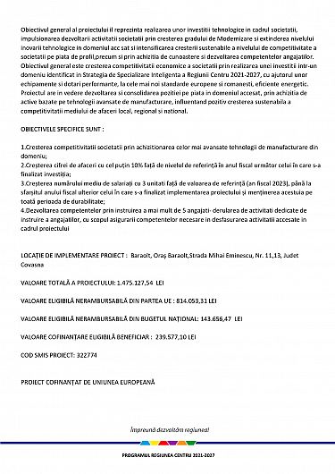 Proiectul are in vedere dezvoltarea si consolidarea pozitiei pe piata in domeniul accesat, prin achizitia de active bazate pe tehnologii avansate de manufacturare, influentand pozitiv cresterea sustenabila a competitivitatii mediului de afaceri local, regional si national.
