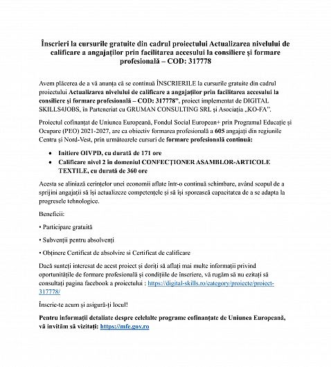 Proiectul cofinanțat de Uniunea Europeană, Fondul Social European+ prin Programul Educație și Ocupare (PEO) 2021-2027, are ca obiectiv formarea profesională a 605 angajați din regiunile Centru și Nord-Vest, prin următoarele cursuri de formare profesională continuă: