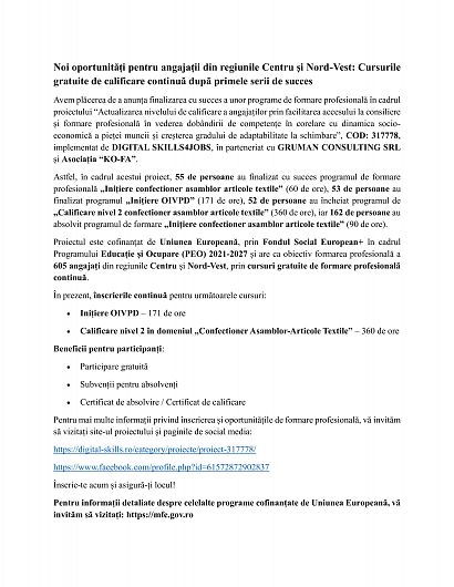 Proiectul este cofinanțat de Uniunea Europeană, prin Fondul Social European+ în cadrul Programului Educație și Ocupare (PEO) 2021-2027 și are ca obiectiv formarea profesională a 605 angajați din regiunile Centru și Nord-Vest, prin cursuri gratuite de formare profesională continuă.