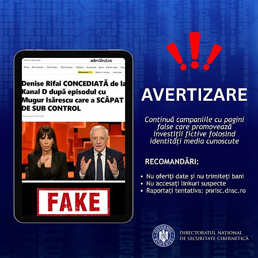 Tentative de fraudă care implică pagini de Internet falsificate, ce imită identitatea unor entități media cunoscute și promovează platforme fictive de investiții, sunt promovate, la acest moment, în mediul online, atenționează Directoratul Național pentru Securitate Cibernetică (DNSC), într-o postare publicată pe pagina de socializare a instituției.