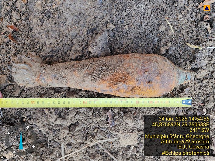 „Sâmbătă, în jurul orei 13:00, echipajele pirotehnice au intervenit în zona Sugaș Băi pentru ridicarea unui element de muniție rămas neexplodat. A fost identificată o bombă de aruncător calibru 82 mm, care a fost ridicată, transportată și depozitată în siguranță, urmând a fi distrusă ulterior”, transmite ISU Covasna.