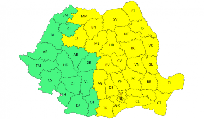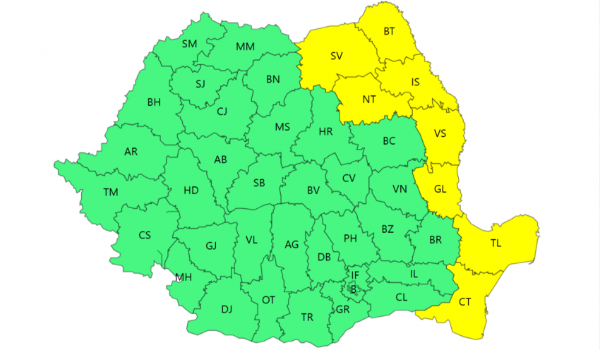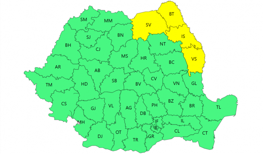 Conform prognozei de specialitate, pe parcursul zilei de vineri, între orele 10:00 - 20:00, va fi Cod galben de temperaturi deosebit de scăzute și, local, ger în nordul și în estul Moldovei, unde maximele vor oscila între -12 și -10 grade. Județele vizate de atenționare sunt: Botoșani, Vaslui, Suceava și Iași.