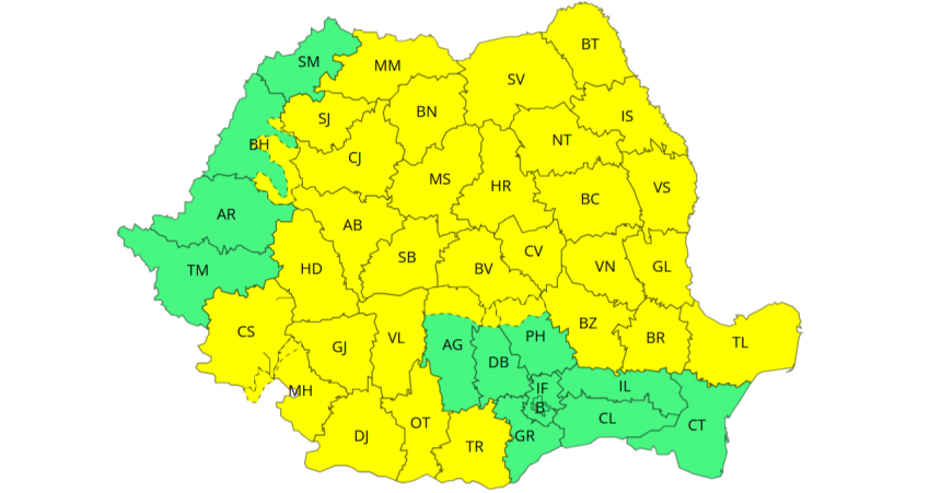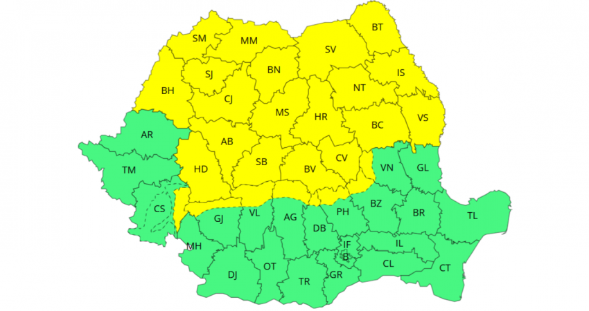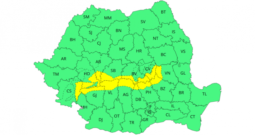 Astfel, pe parcursul zilei de luni, între orele 12:00 - 21:00, va fi Cod galben de intensificări ale vântului în zone din Maramureș, Transilvania, cea mai mare parte a Moldovei și nordul Crișanei, unde rafalele vor ajunge la 50 - 70 km/h. La munte, viteza vântului va atinge 70 - 80 km/h, iar la altitudini de peste 1.700 de metri, de 90 - 100 km/h.