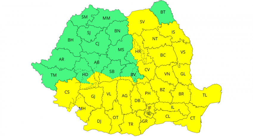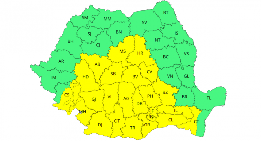 Conform prognozei de specialitate, pe parcursul zilei de vineri, între orele 10:00 - 20:00, va fi Cod galben de intensificări ale vântului în sudul Banatului, Oltenia, în cea mai mare parte a Munteniei și Transilvaniei și în sud-vestul Dobrogei, unde rafalele vor fi de 50 - 70 km/h, iar la altitudini mari în vestul Carpaților Meridionali de 90 - 100 km/h.