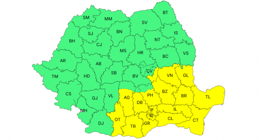 Județele vizate de noua atenționare Cod galben sunt: Constanța, Tulcea, Brăila, Galați, Ialomița, Călărași, Vrancea, Buzău, Prahova, Dâmbovița, Argeș, Olt, Teleorman, Giurgiu, Covasna (parțial), Ilfov și Municipiul București.