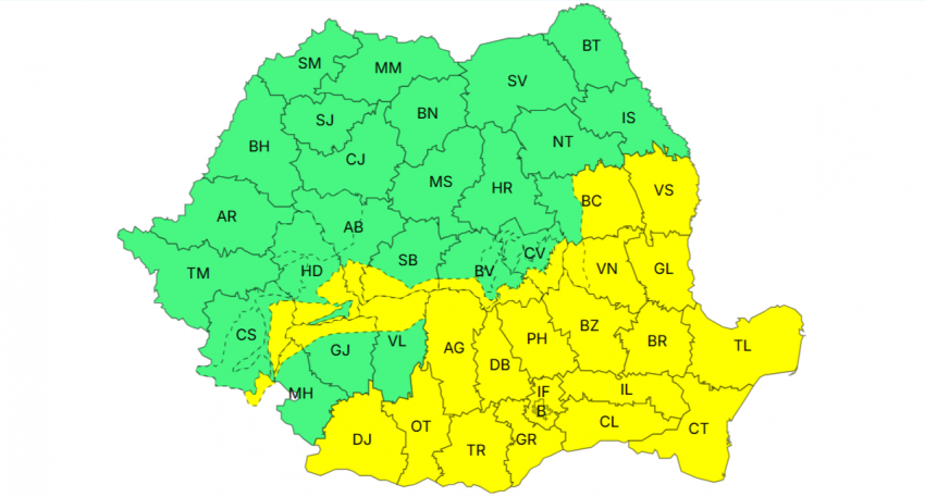 Administrația Națională de Meteorologie (ANM) a emis, luni, atenționări Cod galben de precipitații, intensificări ale vântului și viscol, valabile marți și miercuri, în aproape jumătate din țară.