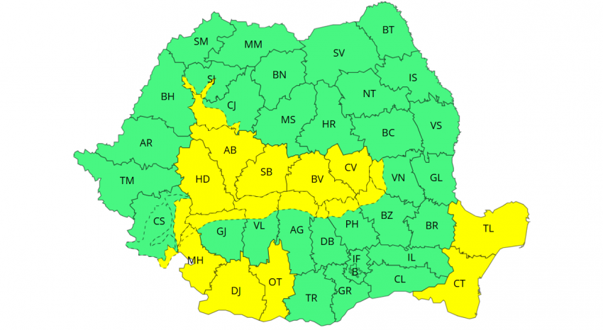 Administrația Națională de Meteorologie (ANM) a emis o atenționare Cod galben de vânt puternic în mai multe județe din centrul, sudul și estul țării, valabilă pe parcursul zilei de luni, între orele 12:00 și 22:00.