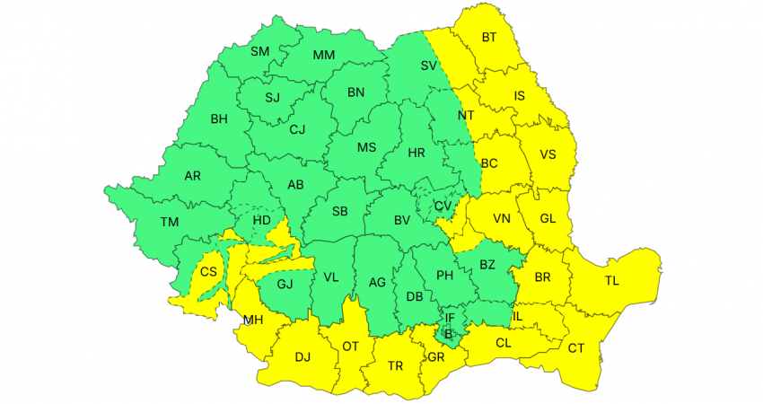 De asemenea, în intervalul 15 februarie, ora 08:00 - 15 februarie, ora 14:00, va fi în vigoare o atenționare Cod galben de intensificări ale vântului. În intervalul menționat, în Dobrogea și în estul Munteniei, vântul va avea intensificări cu viteze la rafală în general de 50...60 km/h.