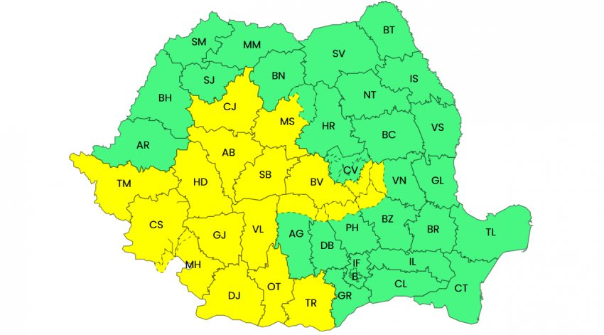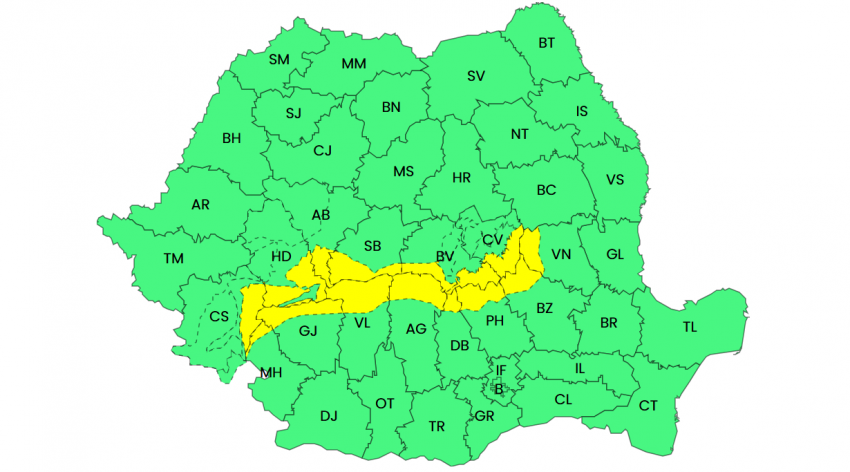 Potrivit meteorologilor, o primă atenționare Cod galben de precipitații însemnate cantitativ, strat de zăpadă la munte, viscol și intensificări de vânt este valabilă în 11 județe din vestul și nordul țării, în intervalul 23 februarie, ora 10:00 - 24 februarie, ora 10:00.