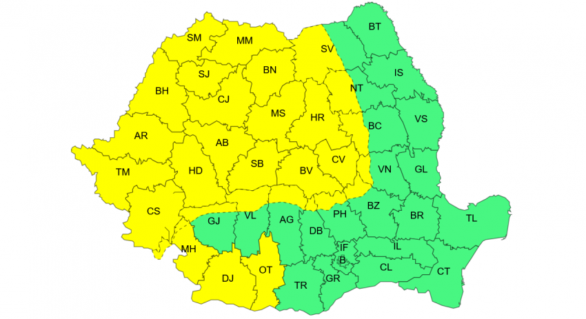 Administrația Națională de Meteorologie a emis două atenționări Cod galben de intensificări ale vântului în mai multe județe din nordul, vestul și centrul țării, valabile până vineri seara.