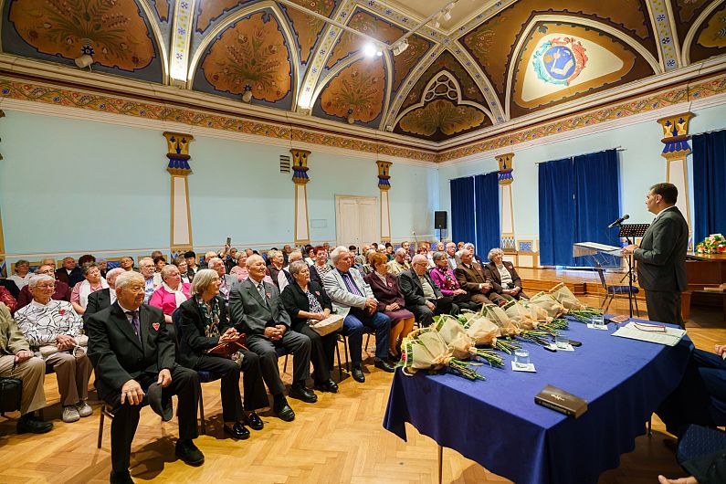 Tradiţia sărbătoririi cuplurilor care împlinesc 50, 60 sau chiar 70 de ani de căsătorie există de peste un deceniu la Sfântu Gheorghe, însă anul 2025 a adus cel mai mare număr de participanţi. Cinci dintre cuplurile prezente au sărbătorit 60 de ani de la căsătorie, iar 33 au împlinit jumătate de secol de viaţă împreună.