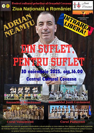 Pe 30 noiembrie, publicul este invitat la Catedrala Ortodoxă Paraclis Episcopal „Sfântu Gheorghe” la seara culturală „Tradiţie şi comuniune în spaţiul intracarpatic”, în cadrul căreia vor avea loc o expoziţie documentară, o masă rotundă şi un concert de colinde. În aceeaşi zi, la Casa Orăşenească de Cultură din staţiunea Covasna va fi prezentat spectacolul folcloric „Din suflet pentru suflet”.