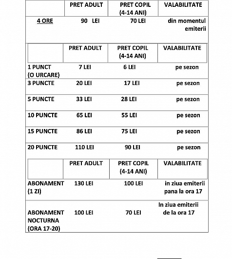 Cartelă cu puncte: O urcare costă 7 lei (adulți) sau 6 lei (copii);