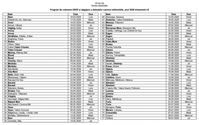 Pe site-ul instituţiei https://www.tega.ro/ro/transportarea-deseurilor a fost postat un tabel cu datele la care sunt programate acţiunile de colectare în fiecare localitate.