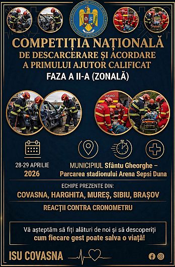 Inspectoratul pentru SituaÈ›ii de Urgență Covasna organizează, în perioada 28–29 aprilie 2026, etapa zonală a CompetiÈ›iei NaÈ›ionale de Descarcerare È™i Acordare a Primului Ajutor Calificat. Evenimentul va avea loc loc în Sfântu Gheorghe, în parcarea stadionului Arena Sepsi Duna.