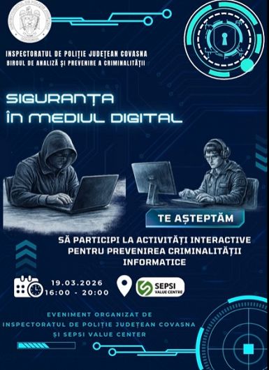 Inspectoratul de Poliție Județean Covasna, prin Biroul de Analiză și Prevenire a Criminalității, organizează joi, 19 martie 2026, un eveniment dedicat siguranței online, desfășurat la Sepsi Value Centre din Sfântu Gheorghe. Sub titlul „Siguranța în mediul digital”, inițiativa își propune să aducă mai aproape de cetățeni informații despre riscurile din mediul online și metodele prin care acestea pot fi evitate. Activitatea va avea loc în intervalul orar 16:00 – 20:00 și este deschisă tuturor persoanelor interesate.