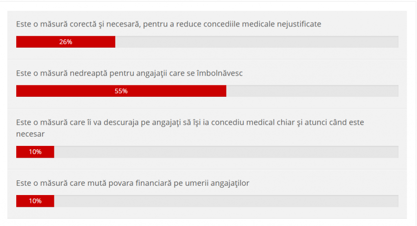 Peste jumătate dintre participanții la sondaj (55%) au o poziție fermă și susțin că măsura este nedreaptă. Această categorie vede în decizia Guvernului o penalizare directă a persoanelor care se îmbolnăvesc și au nevoie reală de recuperare.