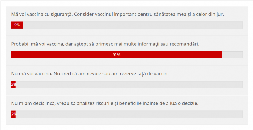 Rezultatele arată că majoritatea persoanelor care au răspuns la sondaj, mai exact 91%, vor să se vaccineze, dar încă așteaptă informații suplimentare sau recomandări înainte de a lua o decizie finală. Doar 5% dintre respondenți spun că se vor vaccina cu siguranță, considerând vaccinul important pentru sănătatea lor și a celor din jur.