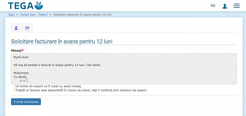- Online: Factura se solicită pe www.tega.ro și se emite în maximum două zile lucrătoare. Plata se poate face direct pe site. Dacă nu ai cont, te poți înregistra folosind datele unei facturi TEGA anterioare.