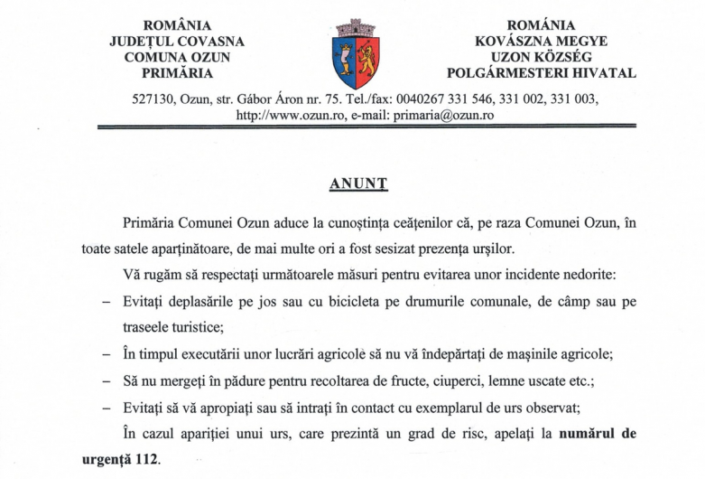 Primăria comunei Ozun a emis un anunț oficial prin care atrage atenția asupra riscului reprezentat de urșii care au fost observați frecvent în apropierea gospodăriilor, pe terenurile agricole și chiar pe traseele turistice din jurul localităților.
