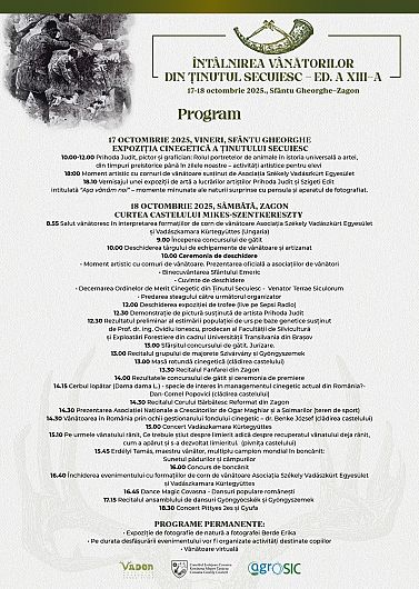 Consiliul Județean Covasna anunță organizarea celei de-a XIII-a ediții a Întâlnirii Vânătorilor din Secuime, eveniment de tradiție care reunește comunitatea cinegetică din județele Covasna, Harghita și Mureș. Manifestarea va avea loc în perioada 17–18 octombrie 2025, la Sfântu Gheorghe, în incinta Muzeului Cinegetic al Ținutului Secuiesc, și la Zagon, în curtea Castelului Mikes–Szentkereszty.
