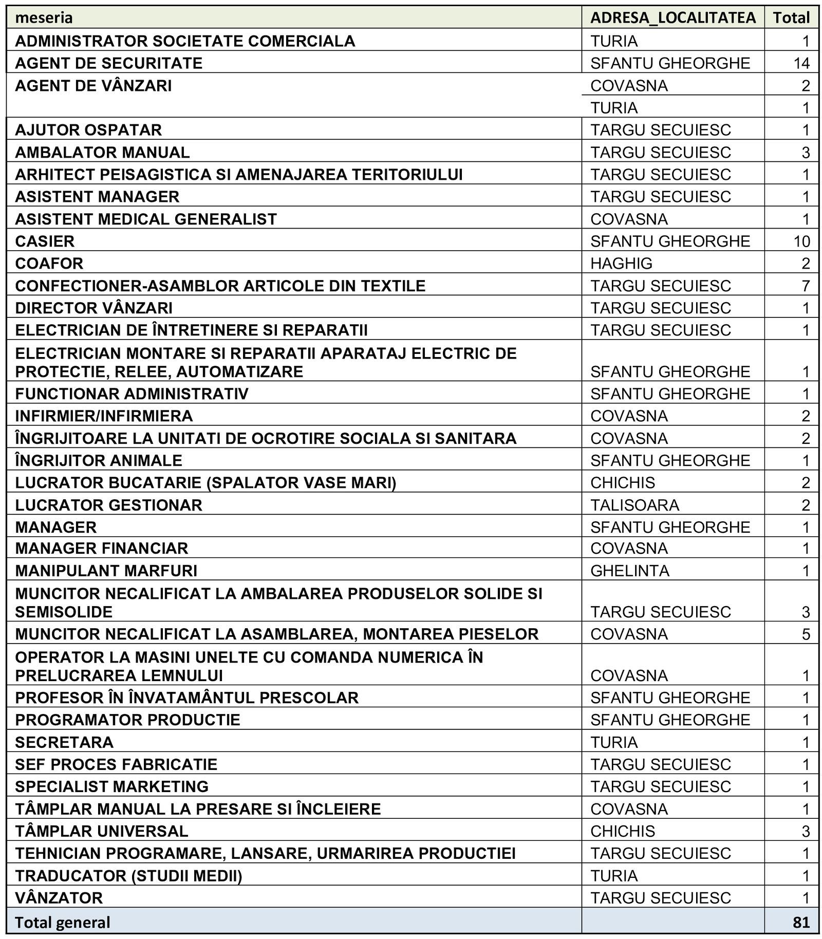 Datele AJOFM Covasna, actualizate la data de 31 decembrie 2025, arată că sunt înregistrate 81 de locuri de muncă vacante.