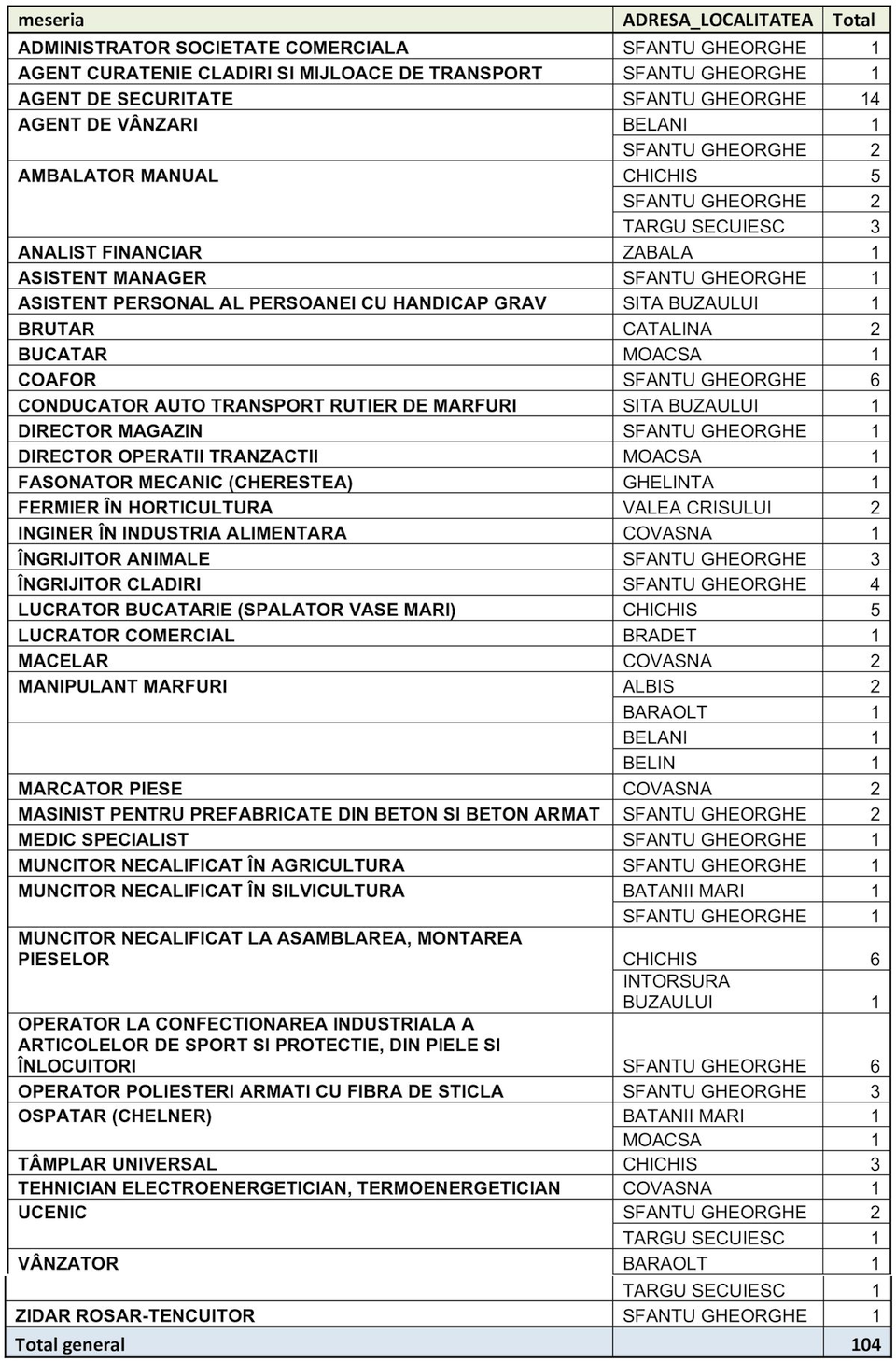 Datele AJOFM Covasna, actualizate la data de 18 martie 2026, arată că în judeţ sunt înregistrate 104 de locuri de muncă vacante.