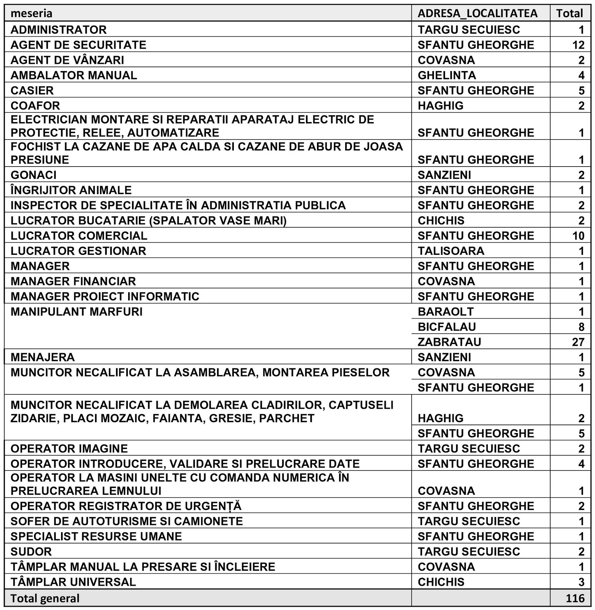 Datele AJOFM Covasna, actualizate la data de 3 decembrie 2025, arată că sunt înregistrate 116 de locuri de muncă vacante.