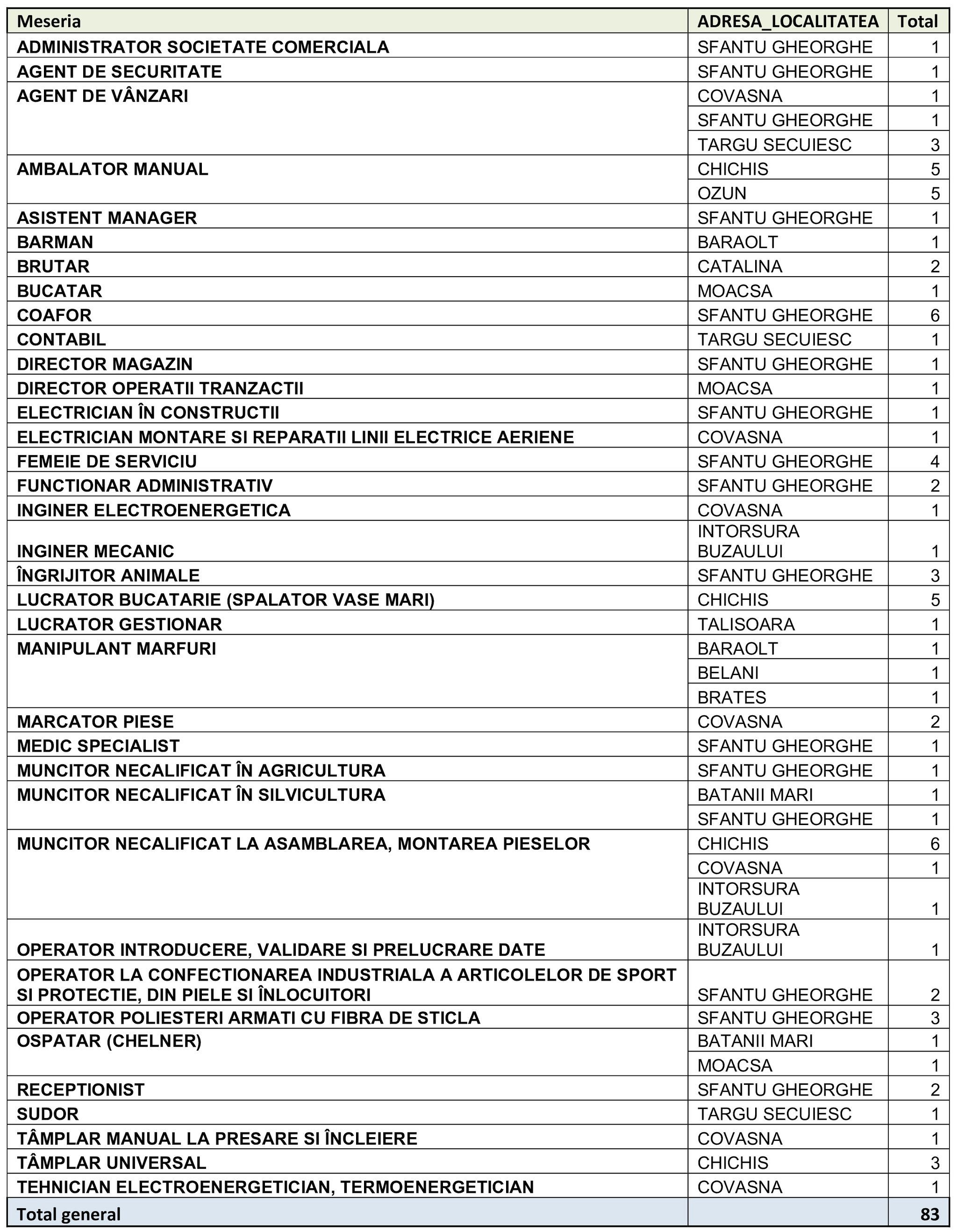 Datele AJOFM Covasna, actualizate la data de 4 martie 2026, arată că în judeţ sunt înregistrate 83 de locuri de muncă vacante.