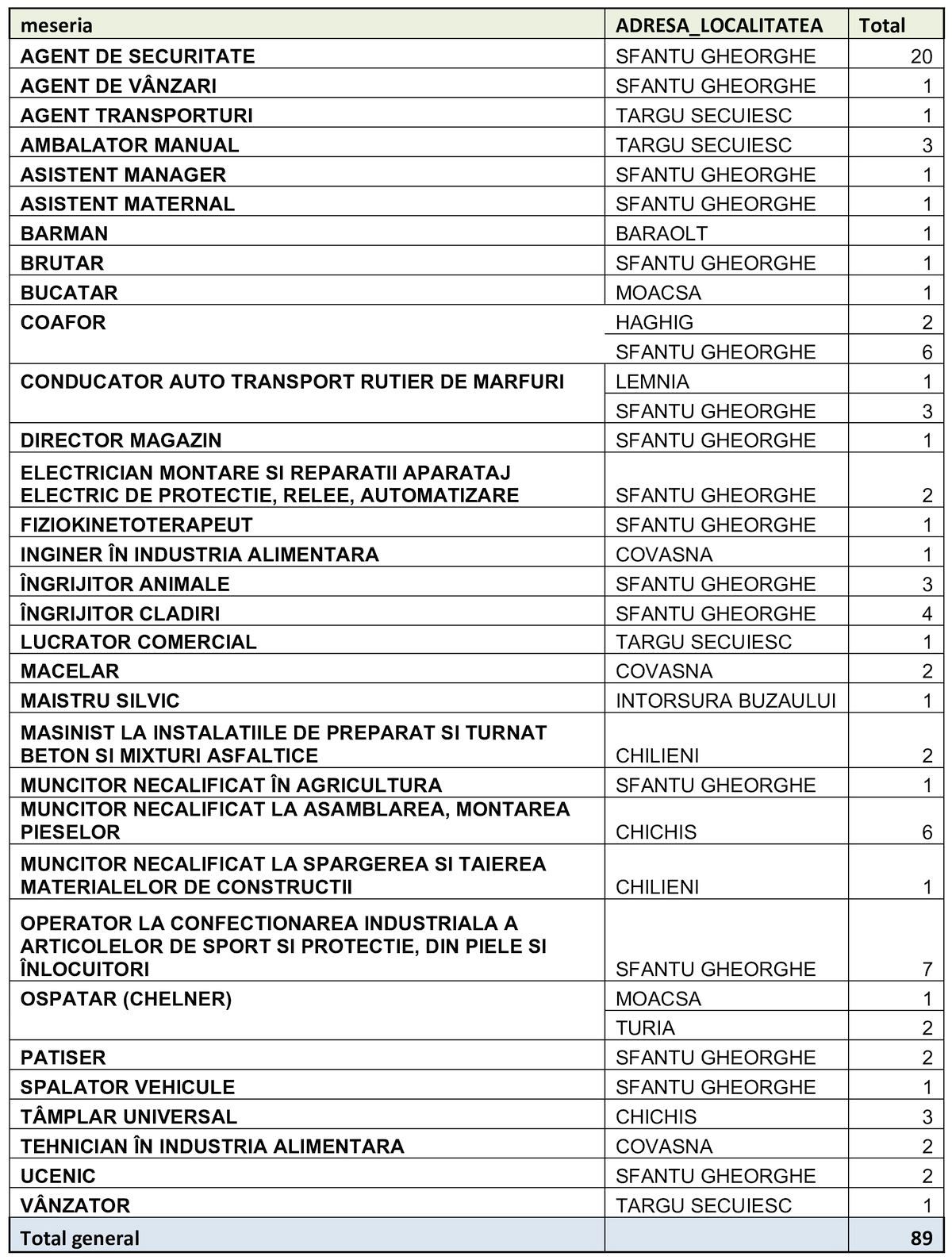 Datele AJOFM Covasna, actualizate la data de 8 aprilie 2026, arată că în judeţ sunt înregistrate 89 de locuri de muncă vacante.
