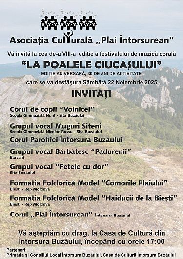 Festivalul de muzică corală „La Poalele Ciucașului” revine anul acesta la Întorsura Buzăului cu o ediție aniversară. Corul „Plai Întorsurean” împlinește 30 de ani de activitate, iar momentul va fi marcat sâmbătă, 22 noiembrie, de la ora 17.00, la Casa de Cultură din oraș.