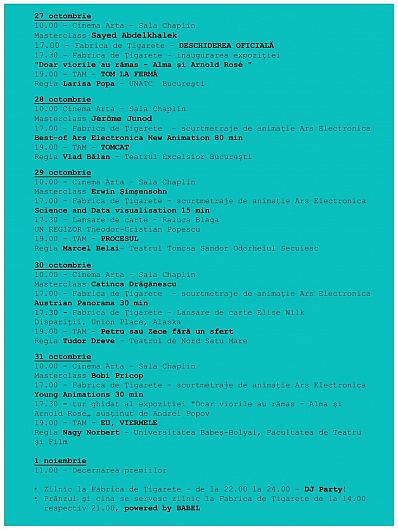 Evenimentul, organizat de Teatrul „Andrei Mureşanu”, se va desfăşura până pe 1 noiembrie, iar în program sunt cuprinse spectacole la care publicul are acces gratuit, masterclass-uri susţinute de membrii juriului, respectiv de Sayed Abdelkhalek, Jerome Junod, Erwin Şimşensohn, Catinca Drăgănescu şi Bobi Pricop, precum şi expoziţii, proiecţii de filme şi lansări de carte.