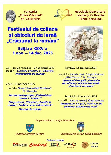 Ediția cu numărul 35 a Festivalului de colinde și obiceiuri „Crăciunul la Români” ajunge la final, cu două spectacole de gală în acest weekend. Sâmbătă, 13 decembrie, de la ora 15:00, la Sfântu Gheorghe, și duminică, 14 decembrie, la Târgu Secuiesc, publicul este invitat să se bucure de tradiții, alături de colindători din toată țara și din Republica Moldova.