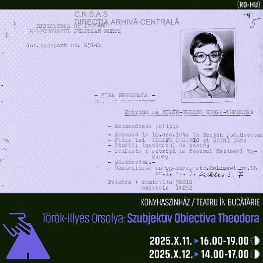 De la ora 16:00, spectatorii sunt invitați la un spectacol de teatru în bucătărie susținut de Török-Illyés Orsolya, cu titlul „Obiectiva Theodora subiectivă” bazat pe piesa audio „Obiectiva Theodora. Fragmente din dosarul de urmărire al unei actrițe din Transilvania”.