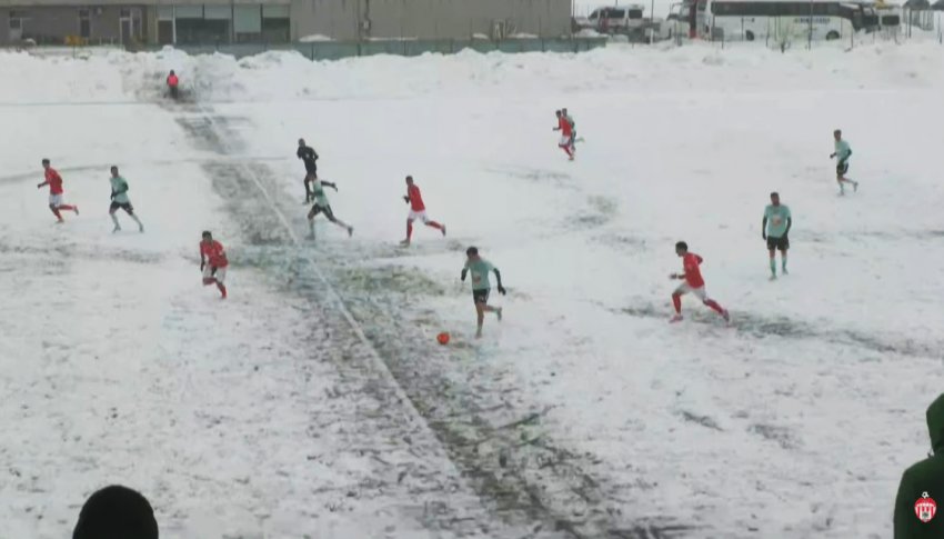 Condiţiile meteo, teren acoperit complet cu zăpadă şi vânt puternic şi-au pus amprenta asupra jocului şi, după nici 20 de minute, arbitrul opreşte meciul pentru ca zăpada să fie îndepărtată de pe liniile care delimitează suprafeţele de joc.